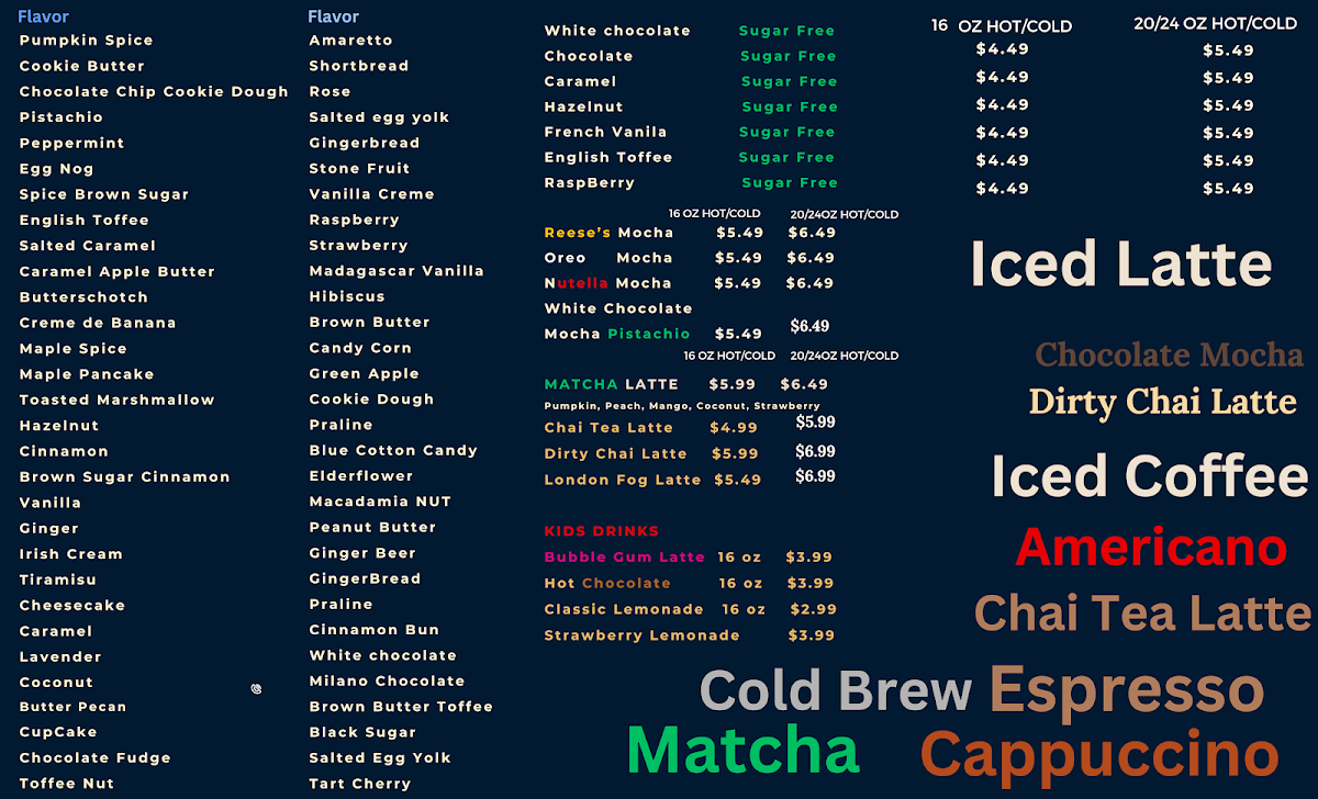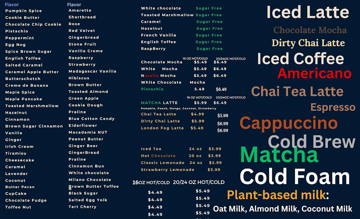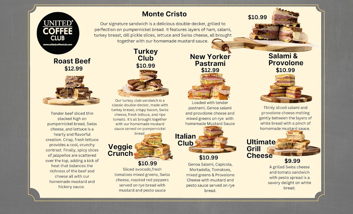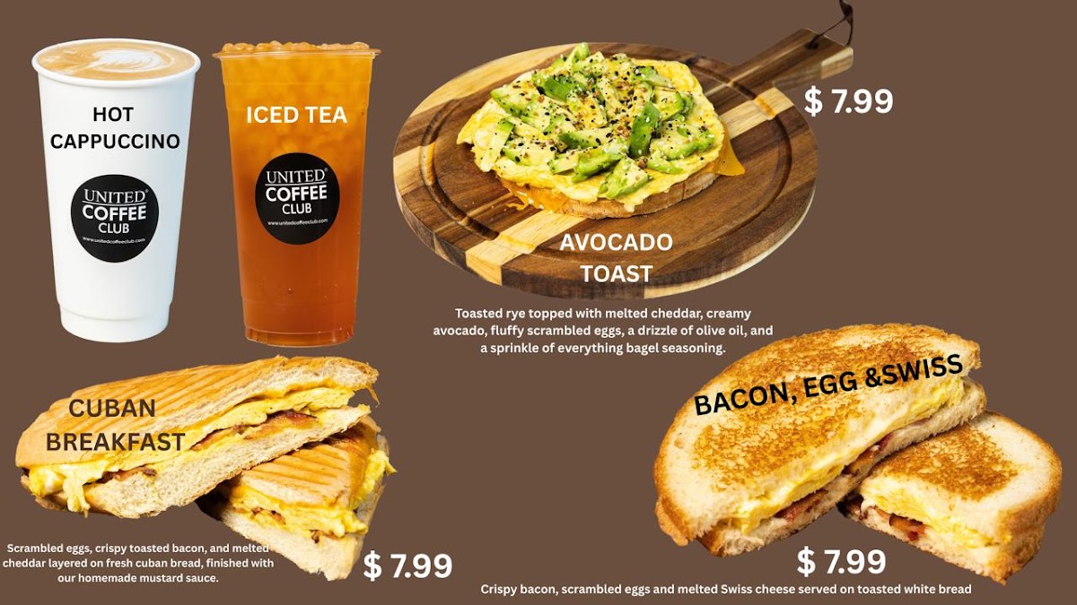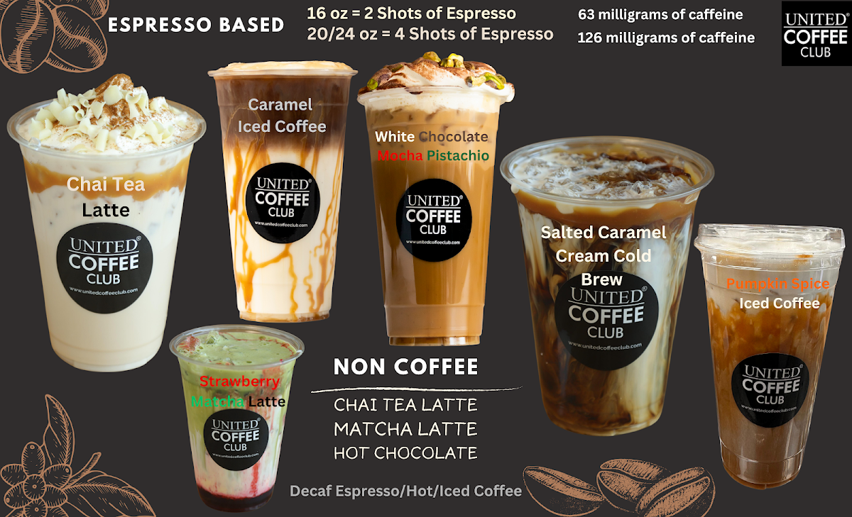 United Coffee Club offers a diverse and indulgent selection of beverages that cater to various tastes and preferences. Coffee enthusiasts can enjoy seasonal favorites such as the Pumpkin Spice, Cookie Butter, Chocolate Chip Cookie, and Pistachio flavors, each bringing a unique twist to the classic coffee experience. For those who enjoy a refreshing minty touch, the Peppermint flavor provides a perfect winter pick-me-up. The menu also includes a variety of mochas, including Chocolate Mocha, White Mocha, Nutella Mocha, and White Chocolate Mocha, each offering rich and decadent options for any chocolate lover. If you prefer a plant-based option, the coffee can be customized with Oat Milk, Almond Milk, or Coconut Milk, ensuring there's something for everyone. Whether you're a fan of bold flavors or a fan of smooth, comforting drinks, United Coffee Club’s menu has a delightful option to satisfy every craving.